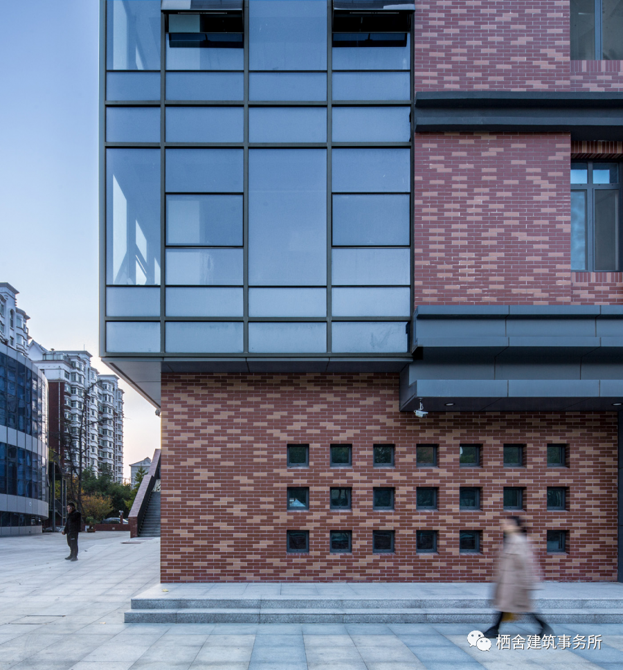 狭长场地中,面临的第二难题便是流线的规划。建筑分为三个入口,南侧与一期建筑围合广场,形成主入口,充分利用与一期现存的建筑关系和现有的车行出入口,提供了城市广场空间,为建筑聚集更多人群,广场两侧建筑高度相同,增加场地的仪式感。